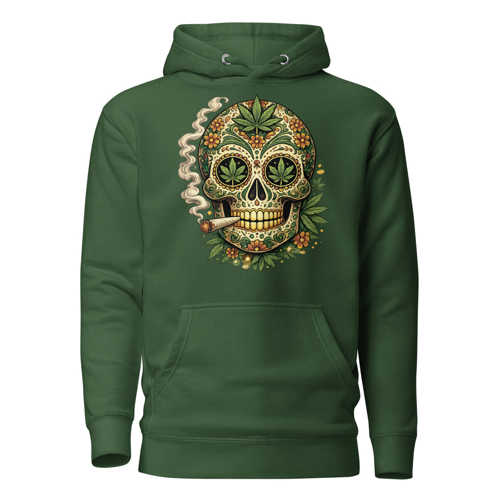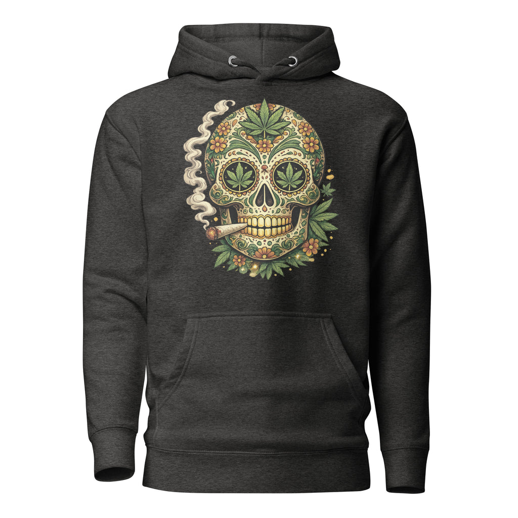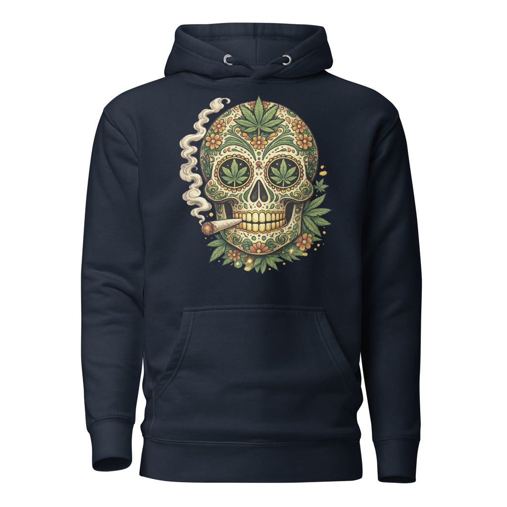 Make a bold statement in this Cannabis Sugar Skull Hoodie, inspired by traditional Día de los Muertos artistry and elevated with modern 420 energy. Featuring a highly detailed sugar skull design adorned with vibrant floral patterns and cannabis-inspired accents, this hoodie blends heritage-inspired art with edgy streetwear vibes.
