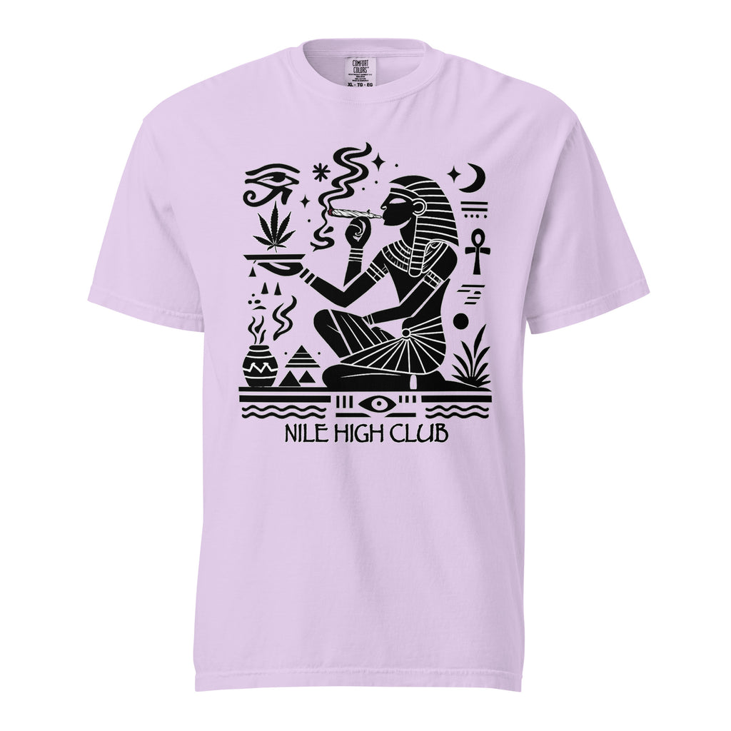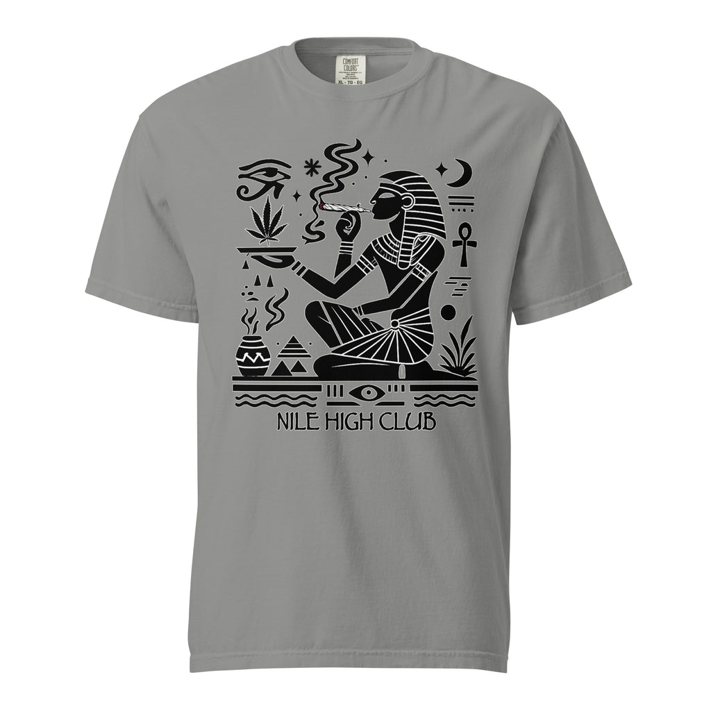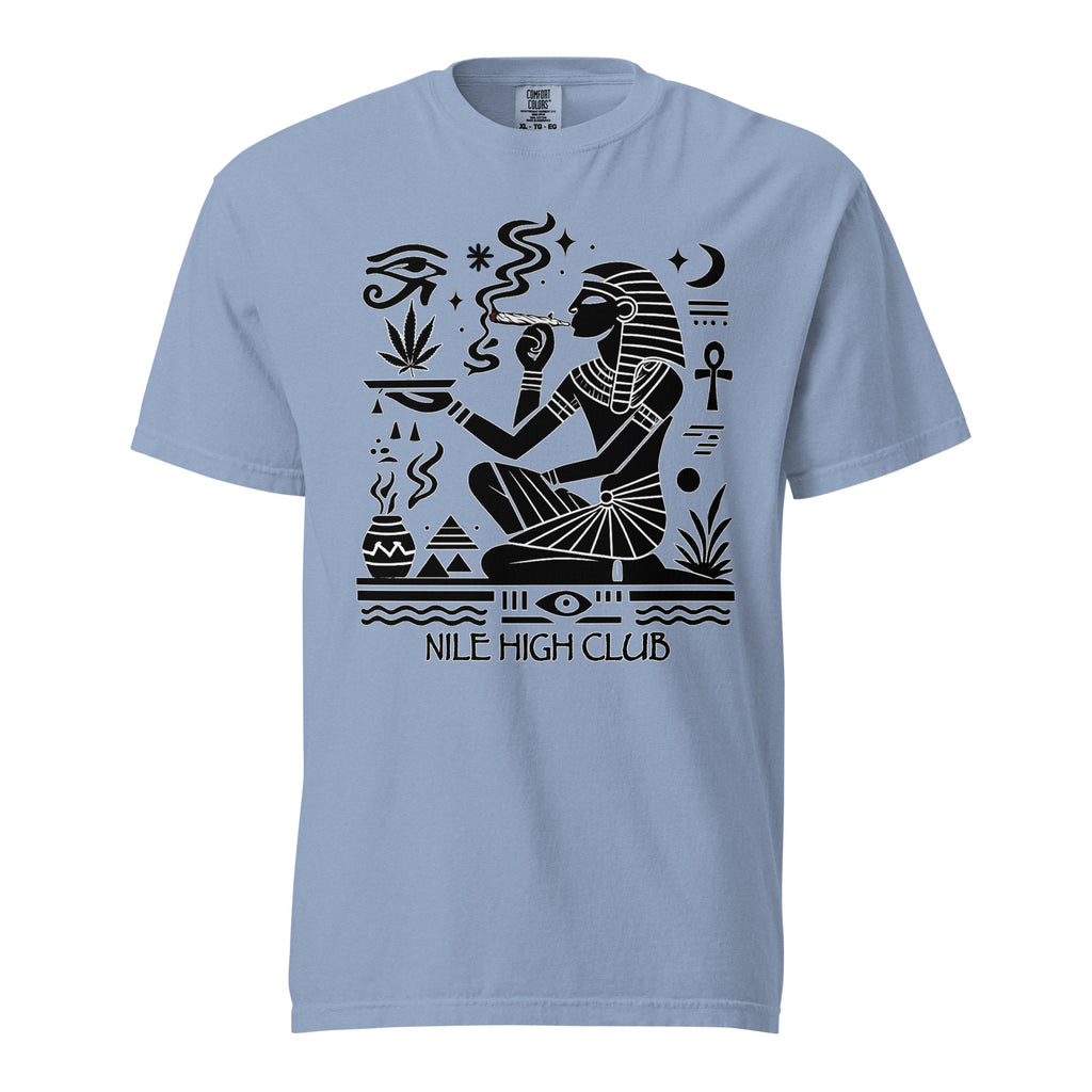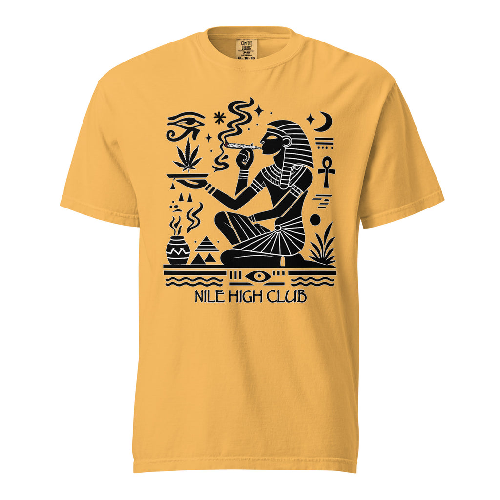 Step into sacred smoke territory with the Nile High Club design — a bold, single-color hieroglyph-inspired illustration featuring an Egyptian figure in strict side profile enjoying a ceremonial offering. Surrounded by ankhs, sacred symbols, and stylized cannabis leaves, this artwork blends ancient mysticism with modern herbal culture.