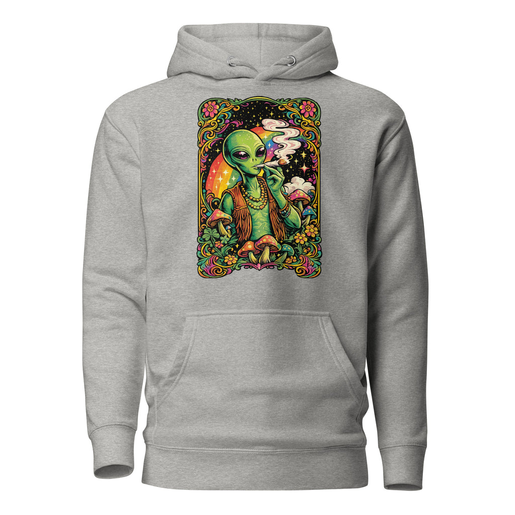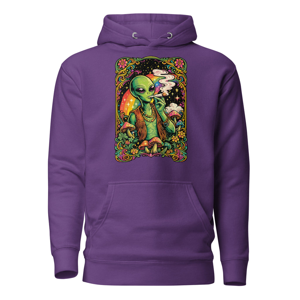This 60’s psychedelic rock poster–inspired hoodie features a laid-back extraterrestrial surrounded by trippy swirls, cosmic stars, mushrooms, and bold vintage concert art energy. The vibrant, high-contrast design channels classic counterculture vibes with a modern cannabis twist.