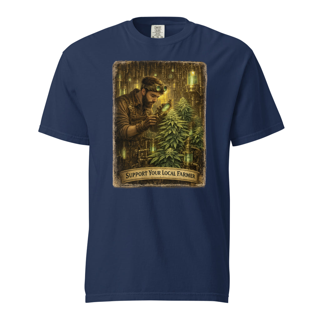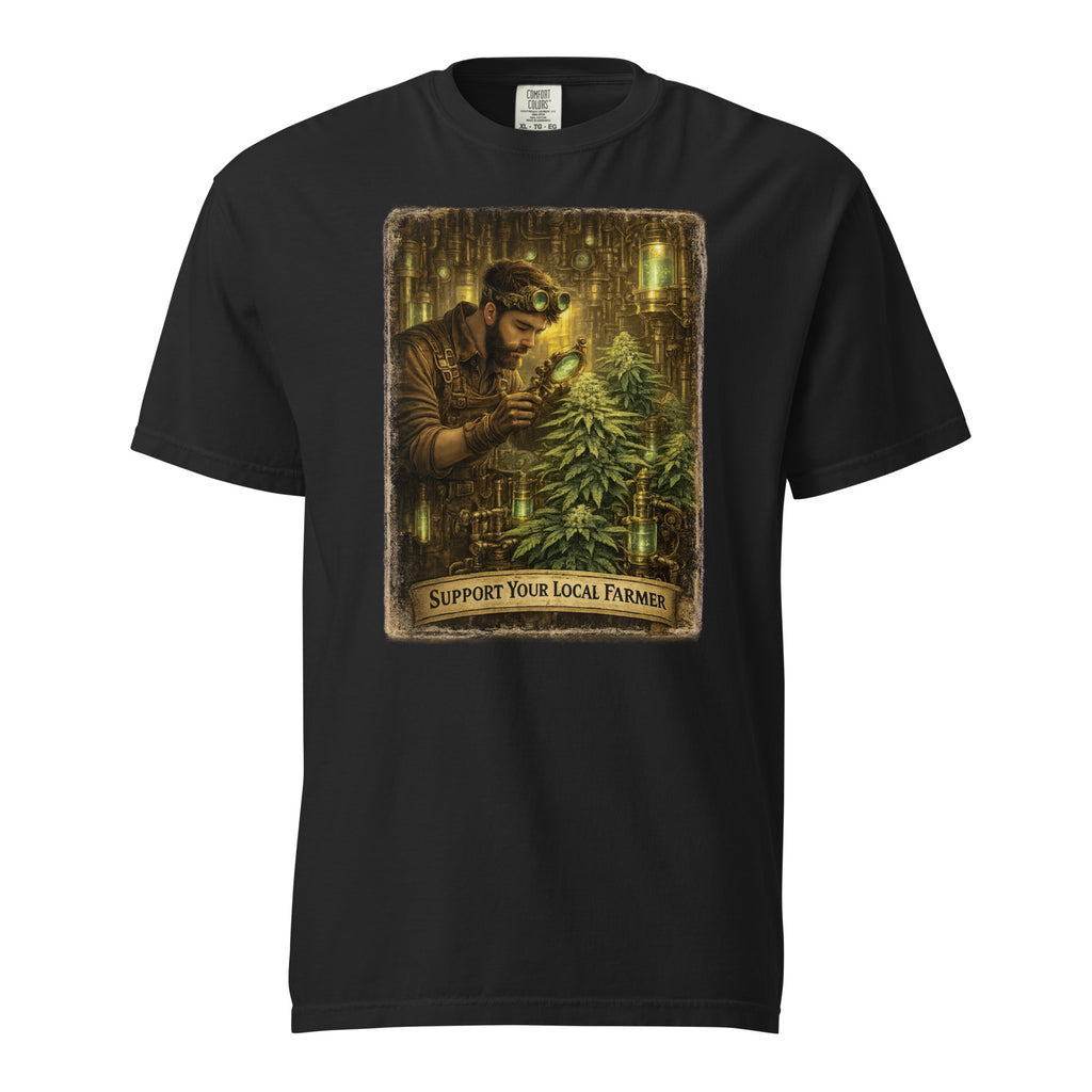 This steampunk cannabis gardener t-shirt features a detailed illustration of a vintage industrial botanist carefully tending a thriving cannabis plant using intricate brass instruments and glowing mechanical apparatus. Surrounded by pipes, gears, and luminous green chambers, the scene blends old-world craftsmanship with futuristic botanical science.