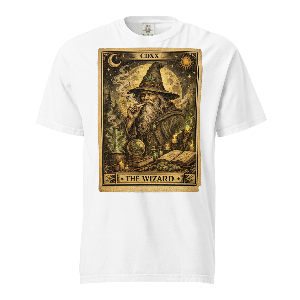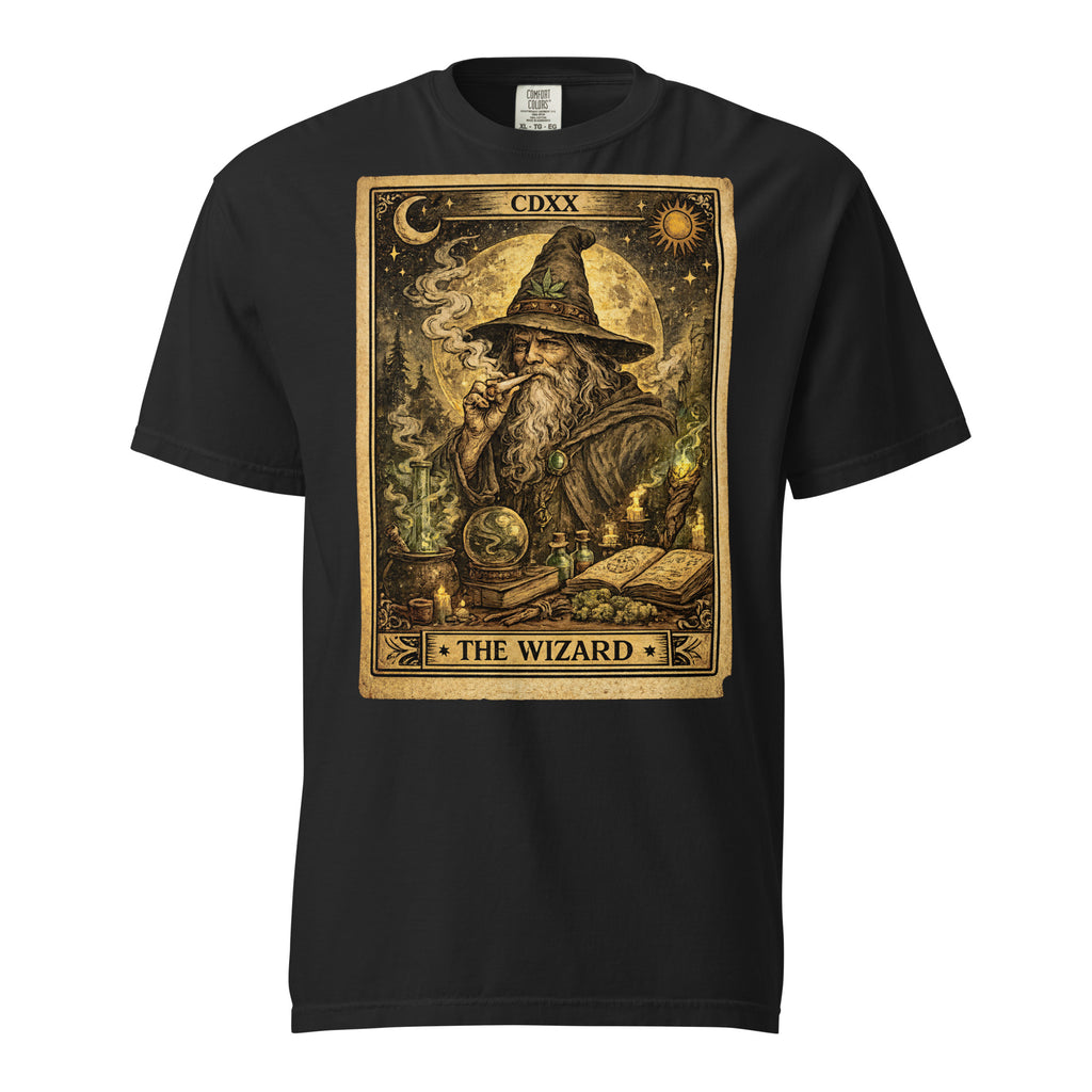 Marked with the Roman numeral CDXX (420) at the top and titled “The Wizard,” this shirt blends magical symbolism with laid-back stoner vibes. The intricate artwork—complete with spell books, potions, celestial elements, and a pointed hat adorned with a cannabis leaf—creates a powerful statement piece for anyone who appreciates weed culture and mystical aesthetics.