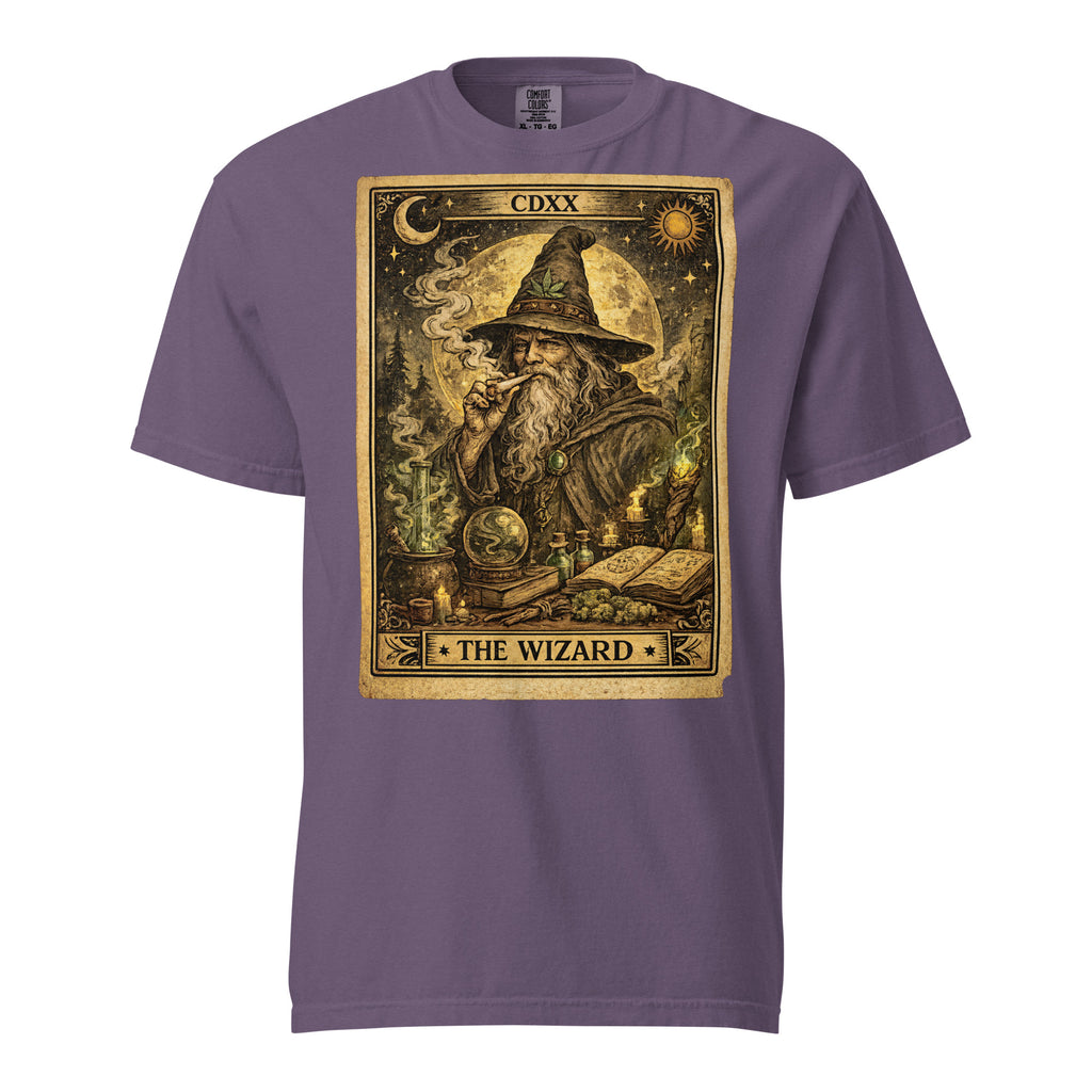 Step into elevated mysticism with The Wizard 420 Tarot Card T-Shirt from Magic Leaf Tees. Featuring a richly detailed vintage-style tarot illustration of a wise wizard enjoying a smoke session beneath a glowing moon, this design merges classic occult artwork with bold cannabis culture.